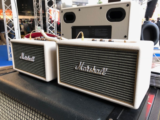 ポタフェス会場一階のオープンスペースにおいて、もう見慣れた光景にも思えるのがこちら、ギターアンプブランド「Marshall」のBluetoothスピーカー展示だ。