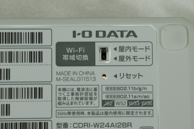 次に、ACアダプターを繋いだCDRI-W24AI2とWi-Fi接続を行う。CDRI-W24AI2の裏面にSSIDとパスワードが書かれたラベルが貼られているので、端末の設定画面から入力する。無線の5GHz/2.4GHzは任意で選ぶことができる。なお、5GHz帯は現在法律により屋外使用が禁じられているので、屋外利用時は帯域利用スイッチを「屋内モード」に入れた上で2.4GHz接続を行う。