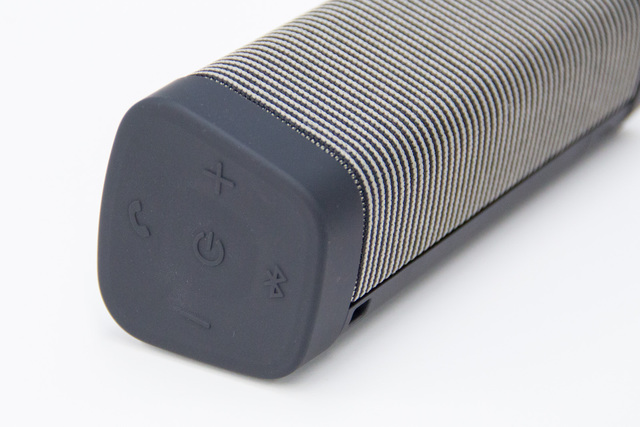 カラーはシンプルな「ブラック」と、個性的な縞模様の「ブラック/グレー」の2種類を用意。個人的にはインスタ映えしそうなブラック/グレーの配色が好みだ。両サイドと背面の一部をのぞく本体表面は、手触りのよいファブリック系素材で覆われている。見た目の質感も手触りもよく、ガジェットやオーディオ機器らしくない落ち付きいた印象がある。