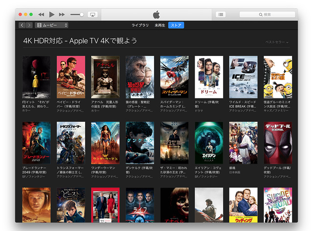 さらに意外だったのが、iTunesでハリウッド作品の4K/HDRコンテンツ数がかなり充実していたことだ。ふだんはビデオマーケットとAmazonプライム・ビデオを利用しているため、これまでiTunesをあまり注視して来なかったのだが、タイトル数こそUHD BDには及ばないものの、筆者がリファレンスにしている作品はほとんど揃っており、しかもその多くがDolby Vision対応となっていた(編注:2018年2月21日時点で129タイトルが4K/HDRタイトルとしてラインナップされていた)。