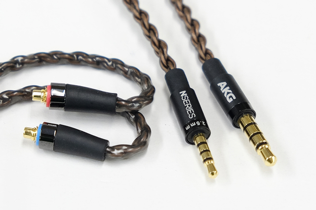 ただ一点、K3003と大きく異なるのはMMCXプラグによるリケーブル対応であるか否かだ。N5005にはiOS/Android両対応のリモコン付き標準ケーブルのほか、同じ線材・構成を用いる2.5mm・4極バランス駆動用ケーブル、さらにはaptXコーデック対応のBluetooth接続用ケーブル、そして日本国内仕様のみ、AKG純正リケーブルである6N-OFC導体を用いた高品位なφ3.5mmストレートケーブル「CN120-3.5」が同梱される。
