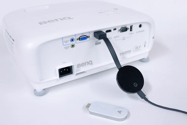 視聴ソースにはGoogleのストリーミングデバイス「Chromecast Ultra」を用意した。Netflixの4K/HDR対応デバイスであるというだけでなく、超小型なのも特徴だ。BD/DVDプレーヤーなどでは設置や配線に悩みがち。背面のHDMI端子に直結できるこうしたデバイスは、プロジェクターとの組み合わせにうってつけだ。