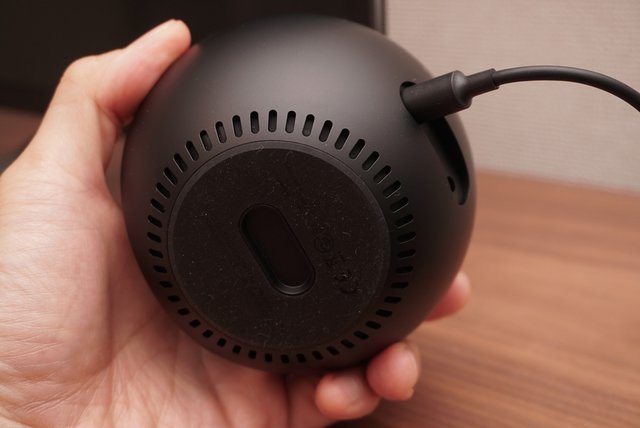 ビームフォーミング対応のマイクは本体の頭頂部に全部で4基、ミュートと音量ボタンを挟んで前後に2基ずつ搭載している。背面には専用の電源プラグを挿すためのポートと3.5mmステレオミニ出力がある。スピーカーは0.8インチのトゥイーターと1.4インチウーファーの2ウェイ構成。本体の底面に向かって全周囲に開口部を設けた。