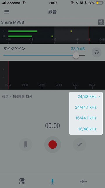 録音ファイルの音質は最大48kHz/24bitまで設定できる。専用アプリを使う外付けマイクとして、音質とファイルサイズのバランスをうまく両立させた仕様だと思う。マイクとしての本領である、楽器の演奏やボーカルのプライベートレコーディングにも大活躍してくれる。音質設定は専用アプリを使って、サンプリング周波数が48kHzと44.1kHzから、ビット深度が24bitと16bitから選べ、それぞれを掛け合わせた4パターンから選択できることになる。