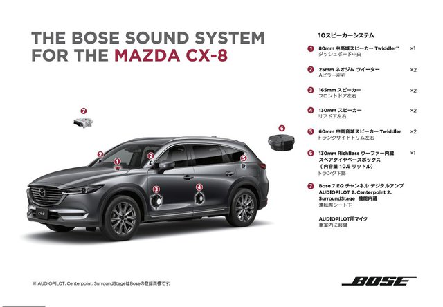 そんなCX-8で見逃せないのが、新車契約時のオプション装備として選べる『Boseサウンドシステム』だ。3列シートすべてで「上質なサウンドが楽しめること」を目的に開発したというこのシステムは、7インチモニターを備えたマツダコネクトに10基のスピーカーと専用設計のデジタルアンプを組み合わせる。