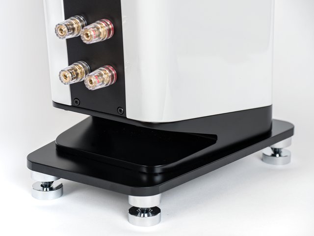 今回のVELA 400 LINEの共通点について先に紹介していこう。大きく変更されたのはキャビネット構造である。フロントバッフルをスラントさせ、時間軸整合を図ったつくりで、アルミダイキャスト製のベース部とシームレスに連結。上面から見ると後方にかけて窄んでいく形状で、内部定在波の影響を抑えるとともに、より剛性の高いキャビネット構造を実現。天板に関してもアルミボードを装着し、不要振動の抑え込みと低重心化へと繋げている。