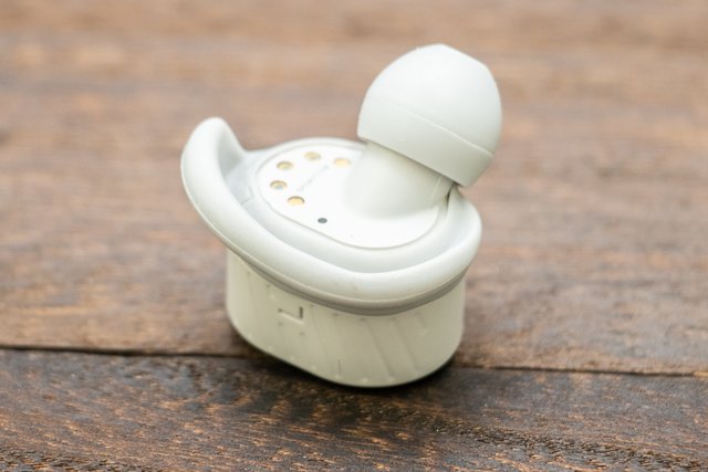 ATH-SPORT7TWは独特な装着スタイルによる、耳元への安定したグリップ感を実現した完全ワイヤレスイヤホンだ。耳穴に挿入するイヤーピースのほか、外耳の周囲にまんべんなくフィットするシリコン製のイヤーフィンを使ってダブルで固定する。体をかなり激しく動かしても耳元のイヤホンはビクともしない。とても画期的なフィッティング設計だと思う。