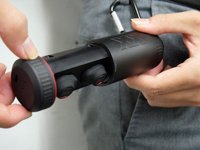 誤ってフタが空いて、イヤホンが落ちないようにケースにはロック機構が付いている。カラビナなどが装着できるリングもある。さらにイヤホンはケース内にマグネットで吸着するので、簡単に外れて落ちないところも気が利いている。ハンドリングしていると、隅々に気を配ったクールなデザインであることが実感を伴ってくる。