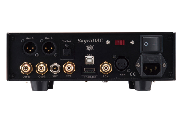SagraDACはPCM384kHz/24bit&DSD11.2MHz対応のUSB-DACだ。USB以外にはBNC、AES/EBU、I2S(HDMI端子を用いたSAW規格)が各1系統ずつ。そしてS/PDIFが3系統(RCA同軸×2、光TOS×1)用意されている。DACの心臓部はデンマークのスークリス・エンジニアリング(Soekris Engeneering)社製R‐2Rモジュールを搭載。27bit処理の構成(3bit分は微小レベルの領域をより正確に再現するために使用)で、合計216個の抵抗を使用しているという。
