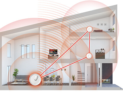 そこで、業界が取り組み始めているのが “メッシュネットワーク”。相互に通信する複数台のWi-Fiルーターと中継機を設置して、「網目(メッシュ)状」にネットワークを構築していき、途中に電波の弱い箇所がないよう、通信経路を自動で最適化し、面でカバーしていく考え方だ。