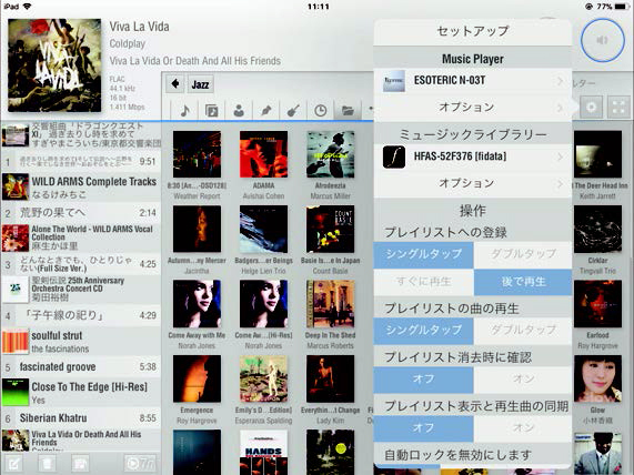 操作については独自の「ESOTERIC SoundStream」を設定。ネットワーク再生コントロール用のiPad/iPhoneアプリケーションだ。タブレットやスマートフォンの画面で曲を選び、プレイリストを作成して再生していく使いやすいもので、タグ情報を使った検索性も良く、アルバムのアートワークのスクロールがすぐにできたり、録音年代別、作曲者別、カテゴリー別などライブラリーの並べ替えも行える。こうした操作性と使いやすさも大きな特徴といえる。