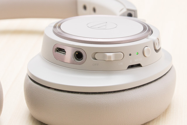 それに伴い、ハウジング下部のボタンやスイッチ類は電源と「クイックヒアスルー機能」操作ボタンの2種類にまで数を減らした。あとは有線接続用の3.5mmジャックと充電用のUSB micro-B端子、LEDランプという構成で、過去のBluetoothヘッドホンに比べてスッキリして見える。