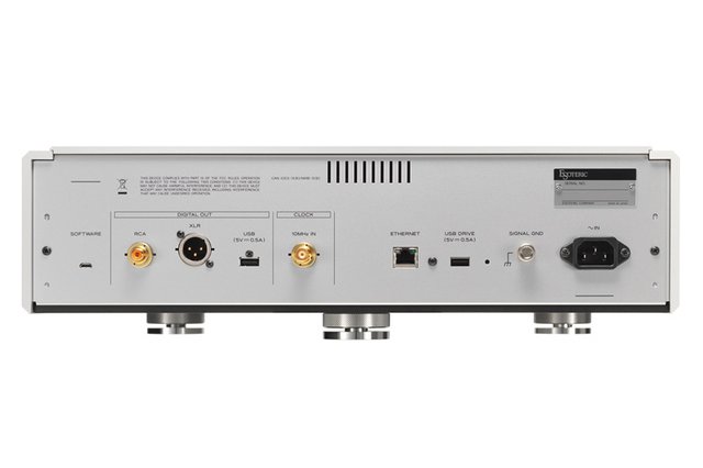 出力は全てデジタル。USB(タイプA)のほか、XLRとRCA同軸出力を1系統ずつ装備する。XLR/RCAでは192kHz/24bitまでのPCM、DSD 2.8MHz(DoP)出力に対応。そのほかクロック入力端子(BNC)も備えている。
