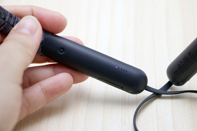 本体操作はネックバンド左側に2つある-/-とマルチファンクションボタンで行う。2つある-ボタンは1度押しで音量+/-、2秒押しで曲送り/曲戻しに対応。マルチファンクションボタンはポーズ/再生に対応。もちろんマイク内蔵で通話にも対応している。
