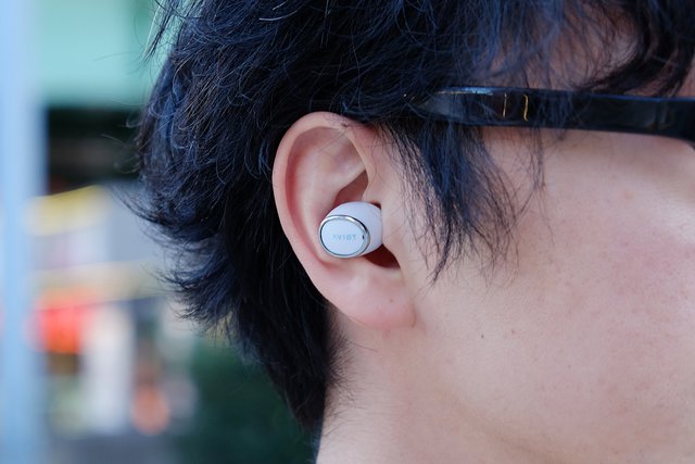 AVIOTのロゴがプリントされたプレート部は、左右ともボタンを兼ねる仕様。ペアリングはR側を6秒押し、再生/停止はLRどちらでも1回押し、曲送り/戻しはR側を2/3回押し、音量操作はL側を2/3回押しと、基本操作はすべて本体から可能だ。各種操作で用いるボタン長押しの段階は、音で教えてくれる。