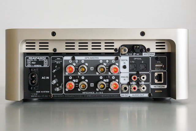 コンパクトなのに本体の質感は高いことも好印象だ。マランツ独自の3ピースデザインを継承しているが、従来機と比較してフロントパネルはボタン配置がシンメトリー化されており、さらに落ち着いた雰囲気を湛えた。ディスプレイは有機ELで、文字も大きく視認性が高い。光沢が美しいトップパネルは、ハードコートによって極めて傷が付きにくいというアクリル素材が用いられている。初めてオーディオシステムを導入する方も、筆者のようなオーディオマニアも納得の品位あるデザインにそそられる。