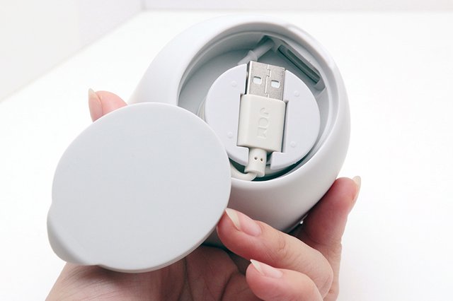 Chill Outの構造としての面白いギミックがスピーカー底面部だ。ここにはラバー製のフタが備えられており、開くと充電用のmicroUSBケーブルが収納されている。ケーブルは本体から直に出ているのではなく、同じフタの中のmicroUSB端子に接続して充電を行う。いざ充電しようというときにUSBケーブルが見つからないということも避けられ、ケーブルを本体内部にコンパクトに巻き付けて収納できるのもいい。なお、AUX端子もこのフタの中に配置されている。本機はIP67の防塵防滴に対応しているのだが、このフタが接続端子部のカバーも兼ねているわけだ。