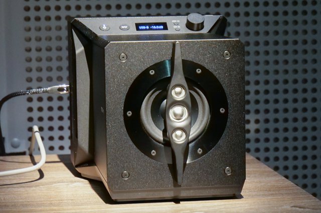 立方体形状のアルミ製キャビネット前方に、3つのトゥイーターを並べた「I-Array」とウーファーが見える。実は同じサイズのアシストウーファーが背中合わせでもう一つ配置され、背面に設けられたスリット状の開口部から低音成分だけを放射する。