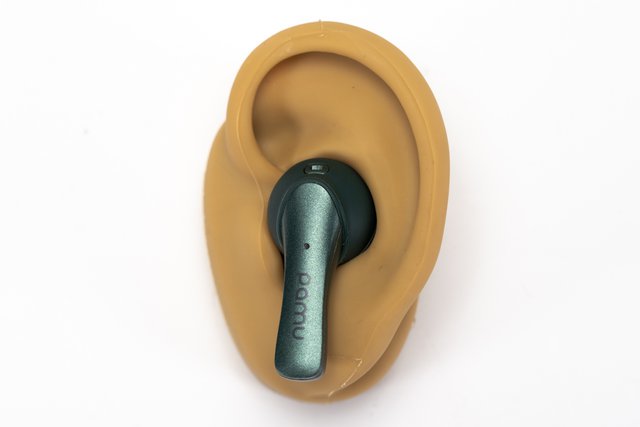 独自性のひとつめは、装着感へのこだわり。マイク部分をスティック形状に伸ばすというデザイン自体は珍しくないが、そのスティック部分も耳の凹凸に合わせた引っ掛かりとなることで装着の安定感を高めている。耳のくぼみに触れることになる本体の半分ほどは薄いシリコンキャップで覆われており、グリップも確保。試しにイヤーピースを外して装着してみても耳にしっかりと固定され、本体だけで十分な装着安定性を確保できていることが分かった。