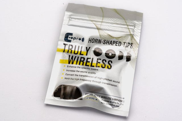 そこに組み合わせる付属イヤーピースがePro Audio「Horn-Shaped Tips」だ。耐久性に優れた炭素系の素材・グラフェンを混ぜ込んだユニークなイヤーピースで、表面の質感はしっとりしなやか、耳への当たりも優しい。一般的なイヤーピースより音の鮮明さを高めるというチューニング上の役目も兼ねている。なお、FALCONに付属するHorn-Shaped Tipsは、現在市販されているモデルとは異なる、完全ワイヤレスイヤホン用に調整されたショートモデルだ。