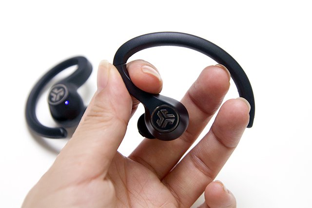 装着スタイルは、3モデルそれぞれに異なっている。JBuds Air Executiveは、先端にマイクを載せたスティック状の本体を耳穴下のくぼみにフィットさせて固定する、アップルのAirPodsによく似たデザインだ。JBuds Air Sportは安定したフィット感が得られるイヤーフックタイプ。そしてJBuds Airがオーソドックスな耳栓タイプになる。