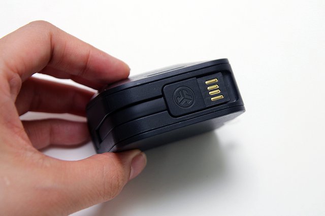 JLAB Audioの完全ワイヤレスイヤホンがとりわけユニークなポイントは、この充電ケースに充電用ケーブルを一体化した点だ。底面にケーブルが格納できて、充電時に引き出して使うかたち。短めのケーブルで、使い終わったらすぐに元のポジションに戻せる手軽さもいい。外出先でノートPCにつないだり、飛行機の中で機内エンターテインメントのUSB充電端子に接続して素速く充電できるので取り回しがよかった。