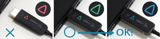 ARC(Audio Return Channel)には非対応ながら、光ケーブル特有の「方向」を知らせる機能が秀逸だ。プレーヤー接続時に方向の成否を赤や緑、青のLED表示で知らせてくれるため、正しく差し込めているかどうか、明確に把握できる。またディスプレイ側には白色LEDを搭載し、懐中電灯がわりに暗所での作業を補助してくれるのも面白い。