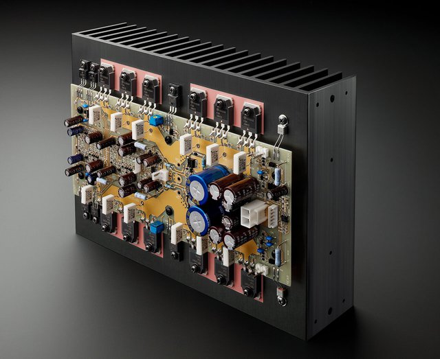 電源回路の両側に鎮座するのが左右チャンネルのパワーアンプブロックだ。巨大なヒートシンクに注目していただきたい。こんなに 大きなプリメインアンプのヒートシンクにお目にかかるのは長いオ ーディオ人生を通じて初めてのことだ。終段の回路はMOS FE Tの6パラレル/プッシュプルで、 クラスA方式で動作している。