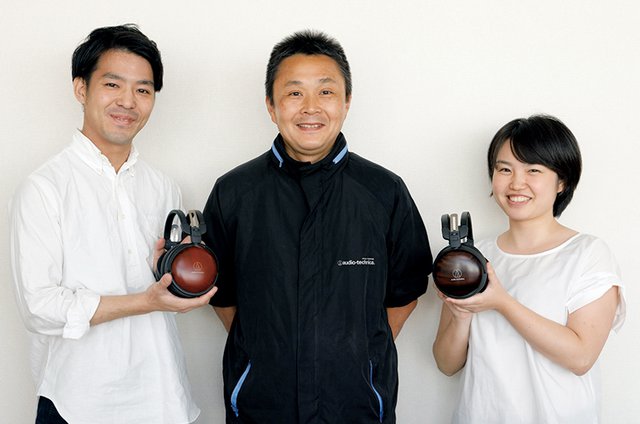 木のヘッドホンの集大成として“アートモニター(A)”と“ウッド(W)”から名を得たAWシリーズは、ハウジングに縞黒檀を用いた「ATH-AWKT」、今回で9品目の採用となるアサダ桜を用いた「ATH-AWAS」から構成され、ATH-AWKTは“伝統”、ATH-AWASは“革新”というテーマが与えられている。今回このAWシリーズの開発リーダーである、技術本部の小澤博道氏と、設計担当の塩飽氏、そしてマーケティング部の伊藤氏から詳細を伺った。