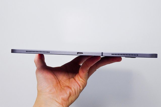 画面の4つのコーナーを面取りして、Touch IDボタンを省いたフルスクリーンデザインは、2018年秋に発売されたiPad Proをそのまま踏襲した。本体の厚みも5.9mmと変わらない。