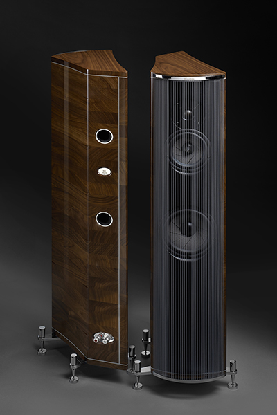 Accordoに比べてサイズはひとまわり大きくなったものの、特徴的な断面形状は完全に一致し、平行面がないエンクロージャーを寄木で組み立てる手法も変わらない。無垢ウォルナットとアルミ・マグネシウム合金のプレートで組んだ構造体は堅固そのものだが、アーチ型フォルムが描く曲線は優美で柔らかく、ソリッド感との対照が鮮やかだ。どの角度から見ても隙のない造形はスピーカーというより楽器や彫刻作品を思わせる。