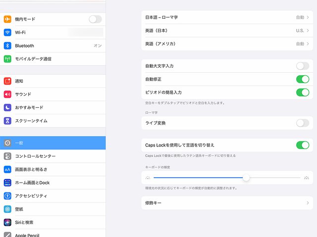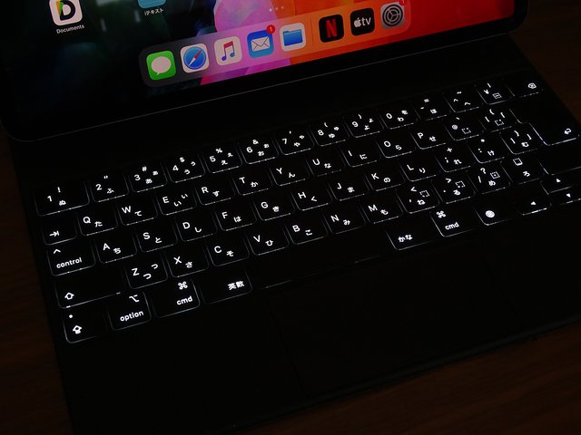 Magic Keyboardにはバックライトが搭載されている。暗い場所で文字を入力する際のミスタッチが減らせるのでありがたい。発表会やイベントなど取材現場でも効果を発揮してくれそうだ。バックライトの明るさはiPadOSのハードウェアキーボード設定から確認できる。基本的にはiPad Proに内蔵されている照度センサーと連動しながら、周囲の明るさに合わせてバックライトをオートディミングする仕様になっているようだ。輝度のスライダーをゼロの位置に移動させるとバックライトをオフにできる。