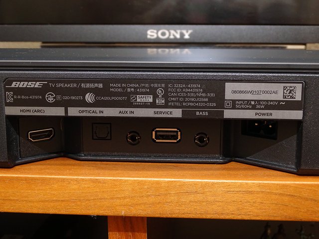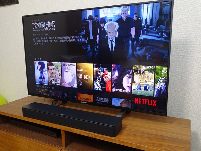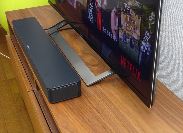 約4年ぶりにBose TV Speakerとしてモデルチェンジを遂げた製品は、やはりテレビスタンドの足下に置き、HDMIケーブルと電源ケーブルをつなぐだけでシンプルに楽しめる。横幅は約60cm。サイズは50インチ前後のテレビとマッチする。Solo 5に比べると奥行き方向の寸法は約1.6cmほど長くなっているが、筆者宅ではテレビラックの上に収まりきった。