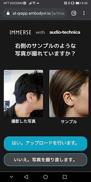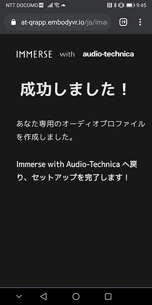Immerseのセットアップに迷うポイントはほとんどないが、右耳の写真を撮る段階で、一旦モバイル用のWebサイトにアクセスして、サイト上から写真を撮影する必要がある点にだけ注意したい。WebサイトにはQRコード経由でアクセスするので、一般的な環境ならスマートフォンを利用することになるだろう。耳の写真を送信するとユーザーに合わせたプロファイルを生成している旨の表示が出るので、そのまましばらく待つと処理が完了し、アカウントへ自動的に紐付けられる。