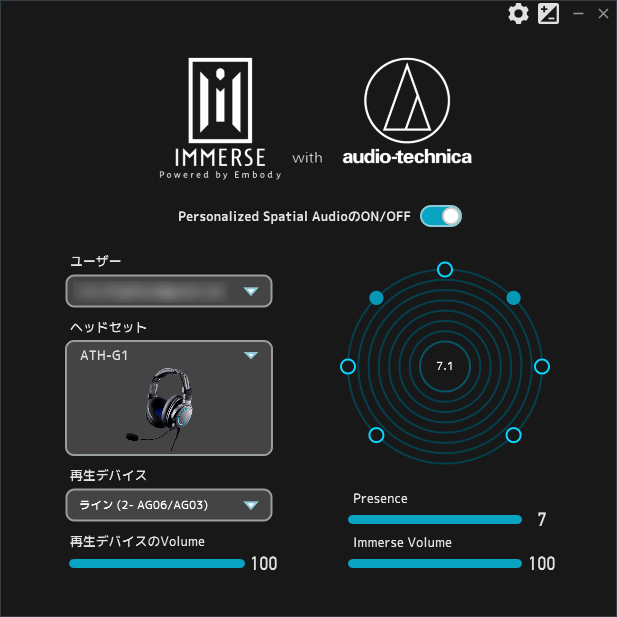 Immerseのアプリで設定できる内容はシンプル。プロファイル(ユーザー)や使用するヘッドセットの切り替え、音量、ショートカットの有効/無効化、Presence(音場距離の微調整)、写真の再撮影だ。Immerse自体のセットアップはUIもわかりやすく、初見でPresenceの意味が少しわかりにくいくらいで、基本的には操作に迷う余地はないといってよい。