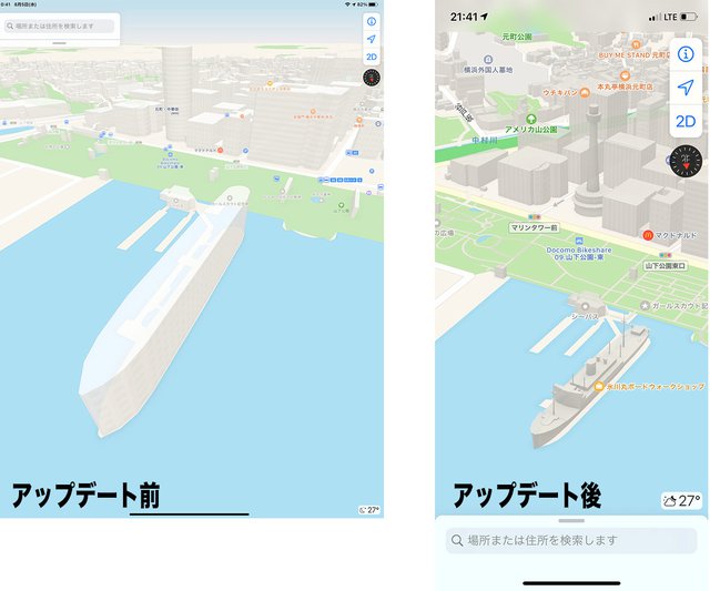 ふたつめには、マップを3D表示に切り替えた際に再現されるランドマークのオブジェクトが増えて、描画精度が向上した。横浜・山下公園に停泊する氷川丸、横浜マリンタワーを見比べてもらえれば差は明らかだ。