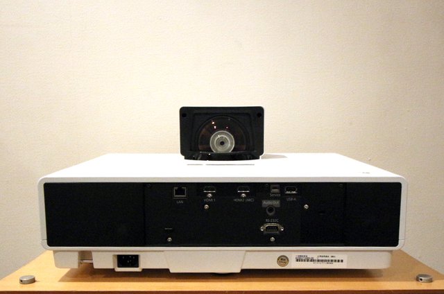 「EH-LS500」の投写距離は100インチで最短62cm、120インチで最短75cmとのこと。ただしこれはレンズからスクリーンまでの距離なので、設置した「EH-LS500」と壁の間で計算すると、100インチで約48.7cm、120インチでも約52.7cm。1.35倍デジタルズームも用意しているので、投写サイズは48型〜130型までをカバーしている。本当に壁際に置くだけで100インチオーバーの大画面が投写されるのだ。これはまさにホームシアターの設置性革命と言えるだろう。