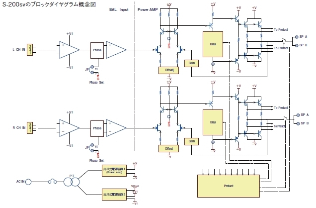 ステレオパワーアンプ「S-200sv」は旧「S-200」のスペシャルバージョンで、大型Rコア電源トランスを核に、高性能出川式整流回路による徹底した電源重視構成。電力増幅部は、トランジスター素子によるパラレルプッシュプル方式、AB級動作で200W/8Ωの最大出力を持つ。