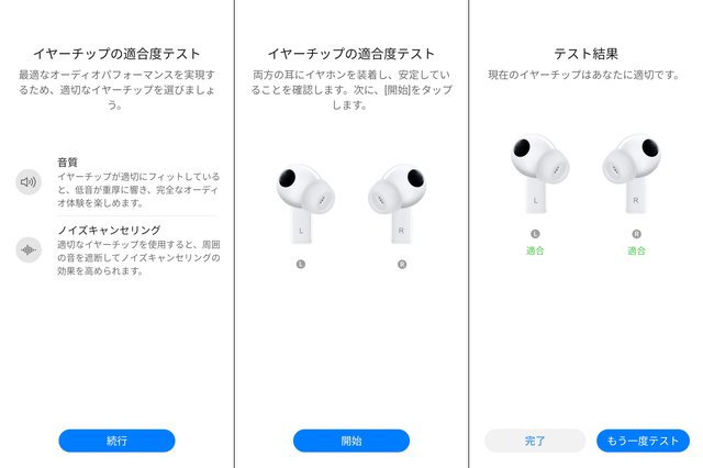 さらにイヤホン内部の前後の音響空間で通気性のある構造で、耳内の空気圧バランスを取り、蒸れたり空気圧が大きく変動しない工夫もなされている。なお、イヤーピースはS/M/Lの3サイズが付属。装着の際にはコントロールアプリ「HUAWEI AI Life(Androidのみ提供)」でイヤーチップのサイズ適合度テストも実行できるので、サイズ選びも完璧だ。