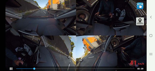 スマホ画面では5種類のビューモードから好みのモードが選択でき、出掛けた先で様々な角度で映像を確認できる。特に360度ドラレコでは多彩なアングルで再生できるが、その一方でドラレコ本体にディスプレイを装備したとしても画面サイズが小さ過ぎてその内容は把握しにくい。その点、スマホ上で展開できればより大きな画面として見られるわけで、これは出掛けた先で映像チェックが必要になったとき大きなメリットになる。