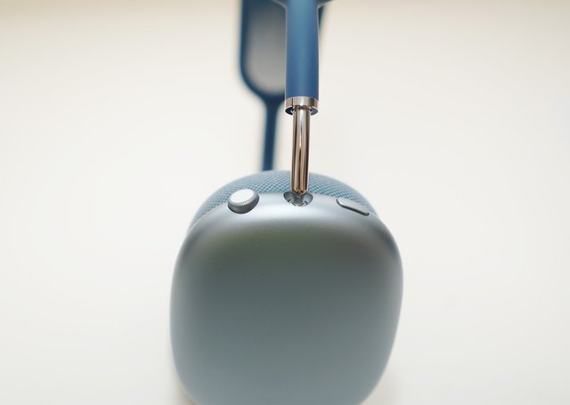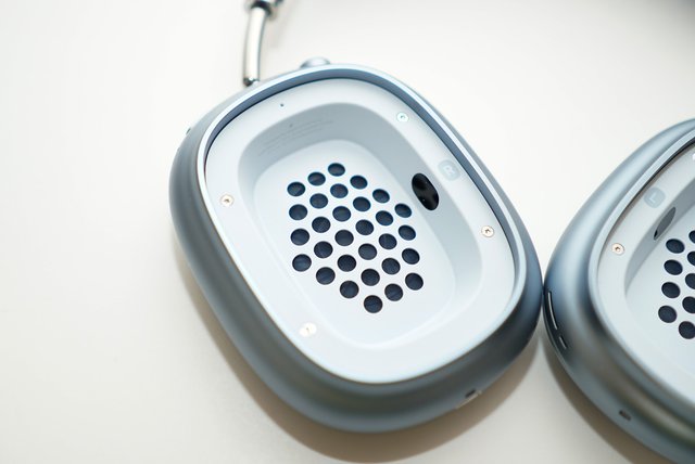 AirPods Maxは密閉型のハウジングに酸化皮膜処理を施したアルミニウムを採用している。つや消し塗装の仕上げもなめらかだ。側面にはアクティブ・ノイズキャンセリング(ANC)とハンズフリー通話のために設けられたマイクの穴がある。