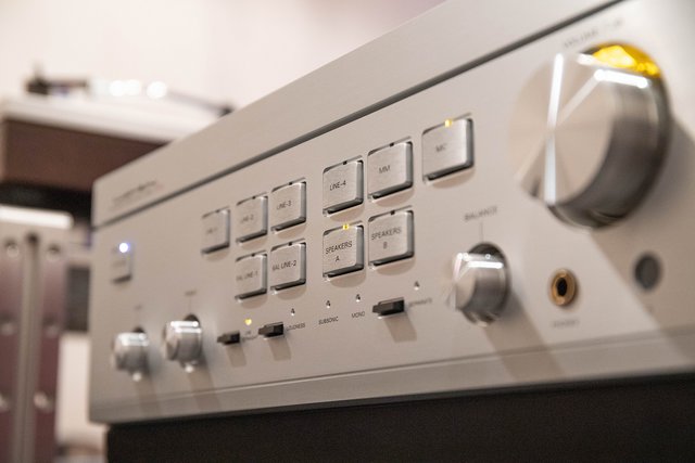 見た目が美しいだけでない。ラックスマンの真骨頂はつまむ、さわる、押す、の触感にある。プッシュスイッチは、押すというより指が何かの引力で吸いつく感じ。押ししろは1mmくらい。節度感があって何とも絶妙だ。ボリュームノブももはや芸術の域。