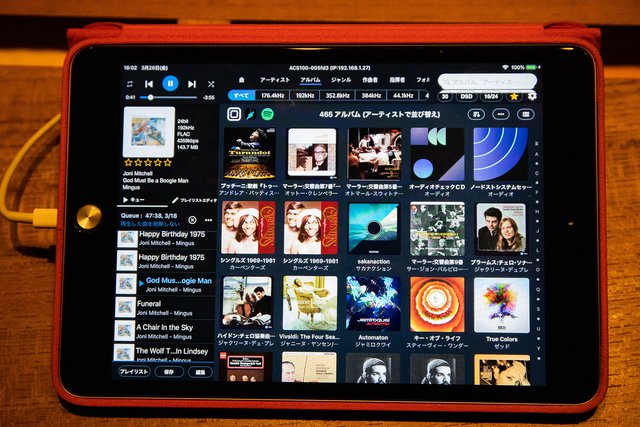 再生アプリ「aurender conductor」にも触れておきましょう。楽曲の再生は、アルバム、アーティスト、ジャンルごとなど簡単に選曲でき、操作もスムーズに行えます。歯車マークの設定を選ぶと、USBメモリや外部NASからの音源の取り込みやストリーミング再生設定などが行えるほか、音源ファイル編集も行えます。また、DSDのPCM変換、dCSのDACなどに対応するAES/EBU出力のデュアル・ワイヤーモードの設定も行えます。これは、dCSの現行製品を愛用する方にとって嬉しいことですね。