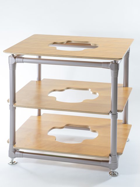鈴木 木製天板を挟み込む形の組み立て式ラックでは人の目線ではしっかりして見えても、スピーカーユニットの振幅、CDレーザーの超精密トレース、ステレオカートリッジの針先の目線で見なおすと一般的な構造のラックは皆、グニャグニャで軟弱なものに見えてきます。それらの点を考慮し、強度と重量のバランスを突き詰めて開発を進めました。普通の方法で強度を高めようとするとどうしても重くなる。逆に軽くしようとすると強度が落ちる。「リジッド」「グランド」の両シリーズ共に、特にこだわったのがパイプフレームの強度を左右する3方コーナージョイントです。これはリジッドシリーズでもアルミ鋳物による強固な設計としていますが、グランドシリーズでは再度、徹底的に検証を重ねた結果、格段に強固なジョイントの開発に成功しました。それはジュラルミンの塊からの削り出しな上、高性能な自動旋盤を利用しても1日に数個しか作成できないことから、リジッド用に比べかなりのハイコストになってしまいましたが。