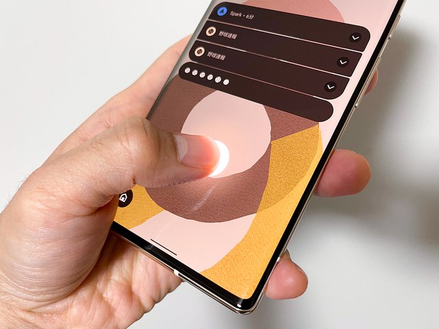 ディスプレイには生体認証に対応する埋め込み型の指紋認証センサーを内蔵する。画面に表示されるセンサー内蔵位置に指紋を登録した指をあてがうと、センサー部分が明るくフラッシュして画面ロックを解除する。「Pixel 5a (5G)」の背面に搭載する指紋センサーに比べると、一呼吸ほど長く画面に指を触れる必要がある。