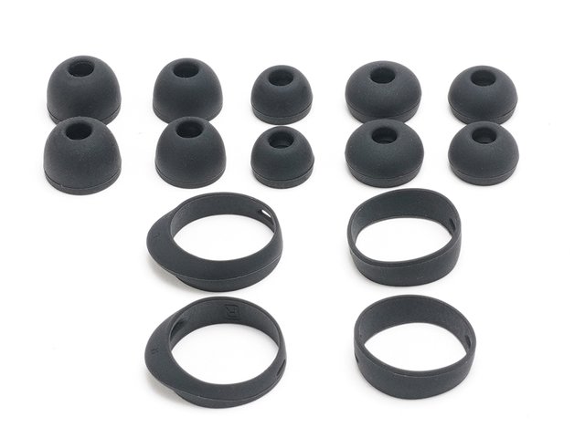 イヤーピースはシリコン製で5サイズが付属した上で、周囲の隙間を埋めるエンハンサーも装着可能。ちなみに、アプリ「JBL Headphones」にはイヤホンのフィット感をチェックする機能もあり、最適な音質や機能を実現できる状態かを確認できる。