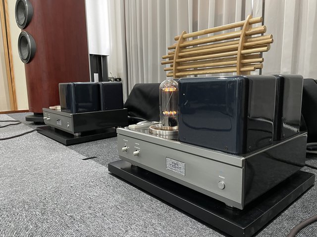 一般的な管球アンプの出力トランスの2次側からオーバーオールのNFBをかけることは避け、より困難な出力管のプレートから初段に向けて多量のローカルNFBをかけることに挑戦し、より奥行き感が増し、高いい空間再現性を獲得した。その出力トランスは、橋本電気製の大型タイプで、特注のチョークコイルと最良のコンビネーションを発揮。電源トランスも高圧用/低圧用と分別した2個使いである。バイアス電流を監視するIPモニター/バイアスメーターは縦振りの大型エッジワイズタイプだ。