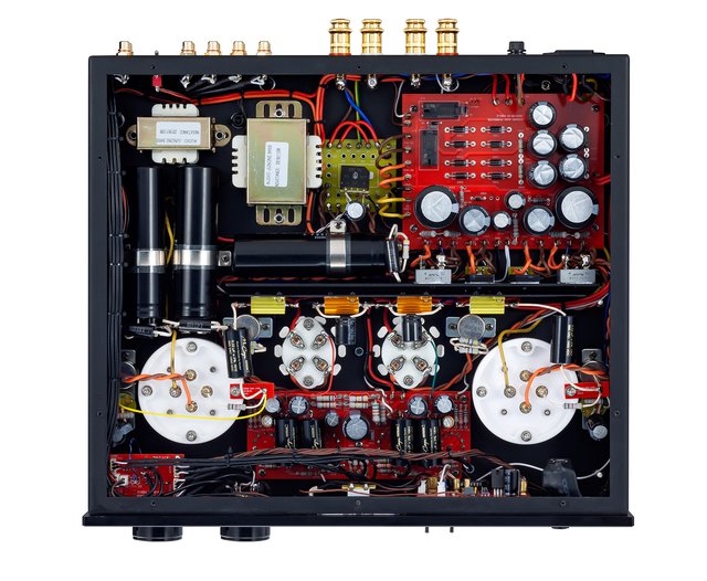 また、極めて直線性の高い独自のワイドレンジ出力トランスにも注目。増幅回路の後部には2枚のシールド板を介して、約1kVという高電圧を電源供給できる強力かつ安定した電源回路も採用している。なお本機はプリアンプ部をバイパスさせパワーアンプとしても使用できる。