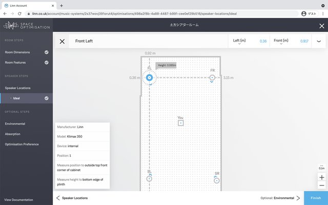 1つ重要な点として、接続完了後には、さらに「スペース・オプティマイゼーション」を適応させる必要がある。パソコンにインストールしたLINNの設定ソフトウェア「Konfig」を立ち上げ、使用している2種類のスピーカーを登録し、部屋のサイズ、スピーカーの位置/リスニングポイントなど合計11箇所の距離を測定。合わせて壁の構造体を設定画面に入力する。入力されたデータは、インターネット経由でLINNのサーバーに送られ、最大ピーク値や周波数の分布を算出する。
