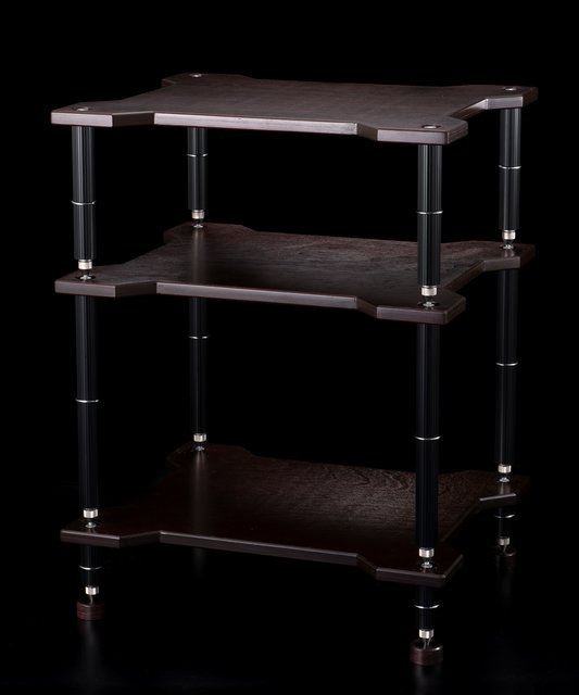 オーディオラックはどのようにして性能を高めるのか。構造は、機器を設置する板材と床に向かい垂直に支持する支柱材によるシンプルなものである。それだけに、機器を直接支えるボード材は重要である。しかし、この材料も単に鳴きがなく分厚い材料が理想というわけではなくなった。広い帯域特性のなかで中間帯域のレスポンスと中高域の性能を高SN比で引き出すためには、MDF材は無難なようで損失が多く最適ではないと判断することができる。